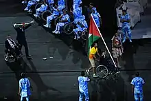 Palestine's first Olympic appearance was at the 1996 Atlanta Summer Olympics.[1] It made its Paralympic debut four years later at the 2000 Summer Paralympics in Sydney, Australia.[2] They have entered every Summer Paralympic Games since, making Rio de Janeiro its fifth appearance at a Summer Paralympiad.[3] Entering the Rio Games, Palestine had won a total of three Paralympic medals in the sport of athletics.[2] The 2016 Summer Paralympics were held from 7–18 September 2016 with a total of 4,328 athletes representing 159 National Paralympic Committees taking part.[4] Palestine sent a solitary athlete to compete in Rio de Janeiro, shot put thrower Husam Azzam.[5] He was accompanied by chef de mission Ihsan Dikidk, Azzam's coach Mohammed Dahman, chairman of the technical committee of the Palestinian Paralympic Committee Ali Al-Nizli and former secretary general of the committee Alaa Al-Shatli.[6] Azzam was chosen to be the flag bearer for the parade of nations during the opening ceremony.[5]