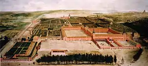 In the 1630s, under the supervision of architects Giovanni Battista Crescenzi and Alonso Carbonell, several buildings were erected in great haste, two of which are still standing: the "Casón del Buen Retiro" which served as a ballroom, and the "Salón de Reinos" (Hall of Kingdoms), its wall decorated with paintings by Velázquez and Zurbarán and frescoes by Luca Giordano.[1]