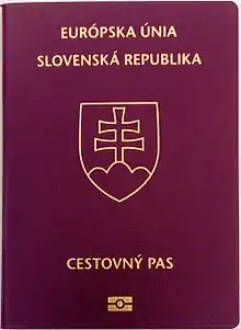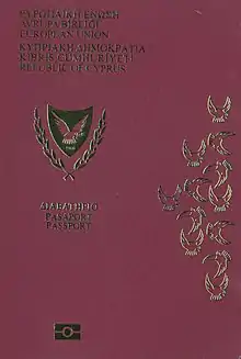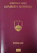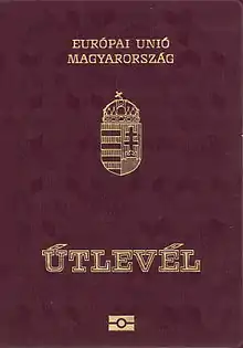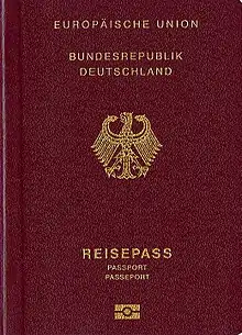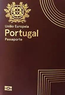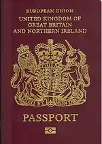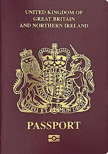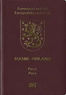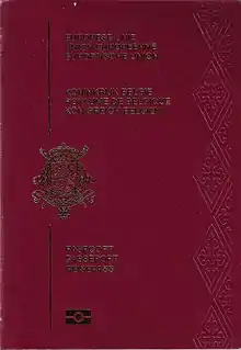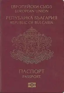 The European Union itself does not issue ordinary passports, but ordinary passport booklets issued by its 27 member states share a common format.[1] This common format features a coloured cover (for which burgundy is recommended but not compulsory: all countries except Croatia follow this recommendation) emblazoned—in the official language(s) of the issuing country (and sometimes its translation into English and French)—with the title "European Union", followed by the name(s) of the member state, the heraldic "Arms" of the State concerned, the word "PASSPORT", together with the biometric passport symbol at the bottom centre of the front cover.[2]