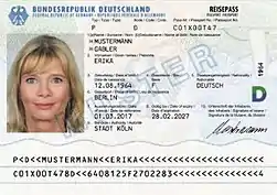 On the top of the identification page there is the code "P" for passport, the code (ISO 3166-1 alpha-3) for the issuing country, and the passport number. On the left side there is the main photo. On other places there might optionally be the passport holder's height and security features, including a smaller, see-through photo.