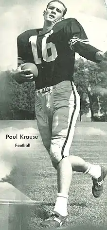 Paul James Krause (born February 19, 1942) is a former American football safety who played in the National Football League (NFL).[1] Gifted with a great frame, speed and range, Krause established himself as a defensive force against opposing wide receivers. He led the league with 12 interceptions as a rookie before going on to set the NFL career interceptions record with 81 (which he picked off from 45 different quarterbacks) and was inducted into the Pro Football Hall of Fame in 1998.[2] Krause was selected eight times to the Pro Bowl during his 16 seasons in the NFL.