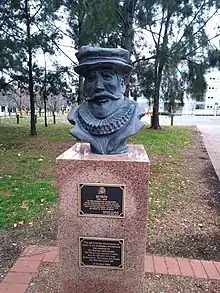 In April 1595 he joined Álvaro de Mendaña y Neira on his voyage to colonize the Solomon Islands, serving as chief pilot.[1] After Mendaña's death in October 1595, Queirós is credited with taking command and saving the only remaining ship of the expedition, arriving in the Philippines in February 1596.[1] Isabel Barreto, Mendaña's young wife, accompanied him, and is often considered to be the cause of the voyage's low morale, and the eventual failure of the mission. She lived luxuriously in the grand cabin while the crew were fed on meagre rotting rations.[1] Robert Graves explored their story in his 20th-century historical novel, The Islands of Unwisdom.