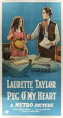 Peg o' My Heart is a 1922 American silent drama film directed by King Vidor and starring Laurette Taylor. It is based on the 1912 play written by Taylor's husband J. Hartley Manners. The play starred Laurette Taylor and famously ran a record number of performances on Broadway.[1] Six reels of the original eight reels survive at the Library of Congress.[2]