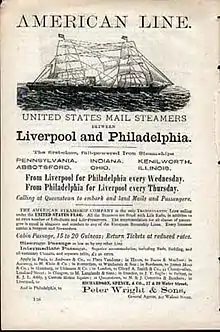 The Pennsylvania class steamships—Pennsylvania, Ohio, Indiana and Illinois—were a class of four cargo-passenger liners built by the Philadelphian shipbuilder William Cramp & Sons in 1872–73. Intended for the newly established American Line, the four ships were at the time the largest iron ships yet built in the United States,[2][3] and were launched with considerable fanfare. Upon entering service in 1874, they also became the first American-built steamships to challenge British dominance of the transatlantic trade since the American Civil War.