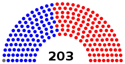 The Pennsylvania House of Representatives is the lower house of the bicameral Pennsylvania General Assembly, the legislature of the U.S. state of Pennsylvania. There are 203 members, elected for two-year terms from single member districts.[2][3]