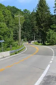 PA 307 leaves Scranton for South Abington Township and traverses forested Bald Mountain, running a short distance to the northeast of the Pennsylvania Turnpike Northeast Extension (I-476). The road narrows to two lanes and continues through wooded areas with some homes, passing under I-476. The route continues through rural land and development and passes to the east of Summit Lake, bending to the north-northwest and heading into the borough of Clarks Summit. PA 307 curves west-southwest and reenters South Abington Township, running through a mix of fields and woods with some development. The road crosses into Newton Township and becomes Winola Road. The route passes to the north of Clarks Summit State Hospital and winds west through more rural land, passing to the north of the community of Schultzville.[3][4]