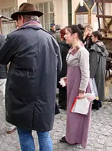 The costume designer for Persuasion was Andrea Galer. Galer made Anne's outfits simple and basic because she does not join in Bath society.[4] The designer explained "I wanted her to look in tune with nature. Because we were shooting in winter, I could go for faded autumnal colours for her. She gets Wentworth back just by her stillness and I wanted to reflect that in her wardrobe."[4] Galer designed a jacket for Hawkins to wear as Anne using a 19th-century shawl, which she mounted and patched together with a cross stitch.[11] She used hand loom fabric from India and the Sri Lanakan crafted Beeralu lace to decorate some of the garments.[11][12] In 2008, costumes from Persuasion went on display at the Jane Austen Centre in Bath. The exhibition included creations worn by Anne, Lady Russell and the Musgrove sisters.[13] Four years later, many of the costumes from Persuasion and Miss Austen Regrets were sold in an online auction organised by the Jane Austen Centre.[14] Galer admitted that while it was difficult to part with them, it was time to move on and she hoped they had been bought because of their association with the Austen films.[14] Galer commented "It was difficult to do but I did it. I suppose the one outfit that did sell that I would've been happy if it hadn't was the Harris tweed jacket and dress worn by Sally Hawkins when she played Anne Elliot in Persuasion."[14]