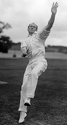 This tour was a very ambitious one for the Americans. They had last toured the British Isles in 1889. Though the results may have been less satisfactory than hoped for by promoters, the tour was arranged mainly for educational purposes and few of those on the American side expected to win many matches.[2] Previous tours had tended to involve amateur English sides with a relatively low level of competition. In 1897 a schedule was made including all of the top county cricket teams, the Oxford and Cambridge University teams, the Marylebone Cricket Club, and two other sides, though only a few of the counties thought it worthwhile to put their best elevens onto the field.[2] While it initially aroused some curiosity, many English fans lost interest until Bart King and the Philadelphians met the full Sussex team at Brighton on 17 June. In the first innings, King proved his batting worth on a fourth-wicket stand of 107 runs with John Lester.[3] He then took 7 wickets for 13 runs and the team dismissed Sussex for 46 in less than an hour.[4] In the second innings, King took 6 for 102 and helped the Philadelphians to a victory by 8 wickets.[5]