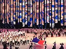 The official training attire of the Philippine delegation is a predominantly red tracksuit which were provided by Asics. The attire of the delegation to be worn in the parade is a Barong Tagalog-inspired clothing was conceptualized by Filipino designer Francis Libiran. The parade attire features a detachable blue and red collar alluding to the Philippine flag and an embossed sun rays motif on the clothes sleeves.[6]