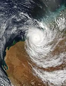 The average annual rainfall in the region is between 200 and 350 millimetres (7.9 and 13.8 in).[6] Almost all of the Pilbara's rainfall occurs between December and May, usually with occasional heavy downpours in thunderstorms or tropical cyclones. The period from June to November is usually completely rainless, with warm to very hot and sunny conditions. Like most of the north coast of Australia, the coastal areas of the Pilbara experience occasional tropical cyclones. The frequency of cyclones crossing the Pilbara coast is about 7 every 10 years.[6][35] Due to the low population density in the Pilbara region, cyclones rarely cause large scale destruction or loss of life.