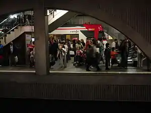 Plaça de Catalunya station, also known as Barcelona-Plaça Catalunya,[1][2] Plaça Catalunya or simply Catalunya[3] is a major station complex in Barcelona located under Plaça de Catalunya, the city's central square and a large transport hub. Many Rodalies de Catalunya, Barcelona Metro and Ferrocarrils de la Generalitat de Catalunya lines go through it and many bus routes link it with all of the districts of the city and most of the municipalities in its metropolitan area.