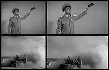 During the first aircraft cockpit scene, the first officer is visibly reading from a script in his lap, and a flash of light from a flying saucer reveals the boom microphone's shadow.[12] The microphone and flight officer's script are not visible in the original theatrical release, as they do not fit the frame for its original 1.85:1 projected aspect ratio.[13] These mistakes are noticeable only in the film's open matte video transfers.