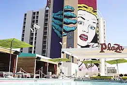 Reflecting the growing influence of public art in downtown Las Vegas, the Plaza boasts three 21-story murals by artists, Shepard Fairey, D*Face and Faile on its North Tower.[16]