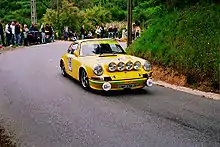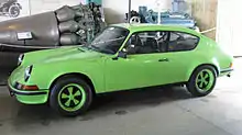 The Carrera RS models, valued by collectors, are considered by many to be the greatest classic 911s of all-time.[5] RS stands for Rennsport in German, meaning "racing sport". The Carrera name was reintroduced from the 356 Carrera which had itself been named after Porsche's victories in the Carrera Panamericana races in Mexico in the 1950s. The RS was built so that Porsche could enter racing formulae that demanded that a certain minimum number of production cars were made. Compared with a standard 911S, the Carrera 2.7 RS had a larger 2.7 L; 164.0 cu in (2,687 cc) boxer-6 engine with a bore x stroke of 90 mm × 70.4 mm (3.54 in × 2.77 in) developing 210 PS (207 hp; 154 kW) at 6,300 rpm and 255 N⋅m (188 lb⋅ft) of torque at 5,100 rpm with Bosch Mechanical Fuel Injection,[6] revised and stiffened suspension, a "ducktail" rear spoiler, larger brakes, wider rear wheels and rear wings. In RS Touring form it weighed 1,075 kg (2,370 lb), in Sport Lightweight form it was about 100 kg (220 lb) lighter, the saving coming from the thin-gauge steel used for parts of the bodyshell and also the use of thinner glass. In total, 1,580 were made, comfortably exceeding the 500 that had to be made to qualify for the vital FIA Group 4 class. 49 Carrera RSR cars were built with 2.8 L; 171.4 cu in (2,808 cc) engines producing 300 PS (296 hp; 221 kW).