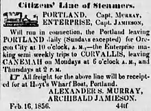 For a brief period starting in 1853 Portland, under captain A.S. Murray, and Multnomah, under Capt George W. Hoyt, were combined together as the People’s Line.[2][3][5] This was the first merger of steamboat interests on the river.[5] As of November 12, 1853 Portland would leave Oregon City daily at 9:00 a.m. for Portland, and leave Portland at 2:00 p.m. on the return trip to Oregon City.[6] Multnomah left Portland at 9:00 a.m. for Oregon City, and departed Oregon City in the afternoon, at 3:00 p.m. to return to Portland. As of April 21, 1855, under Capt. A.S. Murray, Portland was running on a daily route between Oregon City and Portland, departing Oregon City at 8:00 a.m., and leaving Portland at 2:00 p.m.[7]