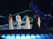 Fernandes sang in the second semi-final on 22 May 2008, performing 19th on the night. Her performance was similar to her performance at Festival da Canção. She again wore the same black dress, with the same backing singers as in Festival da Canção. The stage was filled with blue light, with the background showing blue waves, like in water. The backing dancers had the same choreography as before.[49] She received a total of 120 points, coming second to the Ukraine's Ani Lorak. She received 3 points from Latvia, Malta and Cyprus, 4 points from Lithuania, 5 points from Sweden and Bulgaria, 6 points from Albania, Hungary and Serbia, 7 points from the Czech Republic, Georgia and the United Kingdom, 8 points from Croatia, Belarus and the Ukraine, 10 points from Iceland, and the maximum 12 points from Switzerland and France — receiving no points from Turkey, Denmark and Macedonia. She qualified for the final on 24 May for the first time in Portugal's history since the semi-finals were introduced in 2004.[49][50] The semi-final received 1.45 million viewers, the second-most watched show that day.[51][52]