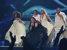 Fernandes' promotional tour began in Bulgaria, where she appeared on many TV shows and sang a duet with the Bulgarian representative at the Eurovision Song Contest 2006 Mariana Popova.[34][35] From 27 to 30 April, Fernandes visited Malta, appearing on various radio and TV shows, giving interviews and singing "Senhora do mar".[36][37] In Turkey, she performed a duet with Şebnem Paker, the Turkish representative at the 1996 and 1997 contests.[38] Finally, after arriving in Serbia for the contest, Fernandes performed a duet with the Beauty Queens, the group that accompanied Serbia's winning singer Marija Šerifović at the 2007 contest, performing both "Senhora do mar" as well as "Zavet", the Beauty Queens' losing entry at Beovizija 2008, the Serbian Eurovision selection for the contest.[38][39][40]