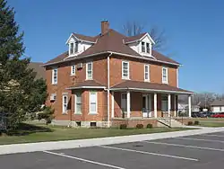 Like the school, the Precious Blood Rectory is a square, two-story brick structure built on an ashlar foundation. Featuring more of a vernacular style of architecture, the house is topped with a hip roof that is pierced by dormer windows on all four sides. Its front door is surrounded by a veranda built with wooden columns and surrounded with a railing.[9] Many parishes in the region built rectories in the early twentieth century in response to a directive issued by the Archdiocese of Cincinnati, which provided that each parish should house its own pastor. The Chickasaw rectory is typical of these structures, which predominantly are two-story rectangles with hip roofs and verandas. It is believed that this common design was influenced by the style made popular by the Sears Roebuck catalogue.[7]