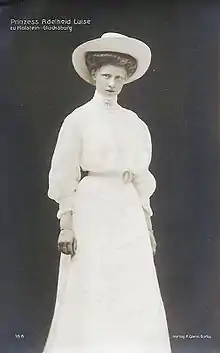 Princess Adelaide Louise of Schleswig-Holstein-Sonderburg-Glücksburg (German: Adelheid Luise; 19 October 1889 – 11 June 1964) was a daughter of Friedrich Ferdinand, Duke of Schleswig-Holstein and his wife Princess Karoline Mathilde of Schleswig-Holstein-Sonderburg-Augustenburg.
