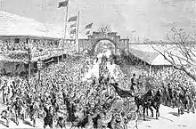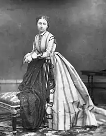 Louise's first few months in Canada were tinged with sadness as her favourite sister, the Grand Duchess of Hesse and by Rhine, died on 14 December 1878. Although homesick over that first Christmas, Louise soon grew accustomed to the winter climate. Sleighing and skating were two of her favourite pastimes. In Canada, as the monarch's direct representative, Lorne always took precedence over his wife, so that at the Opening of the Parliament of Canada on 13 February 1879, Louise was ranked no differently from others in attendance. She had to remain standing with the MPs, until Lorne asked them to be seated.[41] In order for Lorne to meet every Canadian member of Parliament, he held bi-weekly dinners for 50 people. However, some of the Canadian ladies responded negatively to the British party. One of her ladies-in-waiting reported that some had an "'I'm as good as you' sort of manner when one begins a conversation."[42] Court entertainments were open; anyone who could afford the clothing to attend functions was simply asked to sign the visitor's book.[43] Louise's first state ball was given on 19 February 1879, and she made a good impression on her guests when she ordered the silk cordon, separating the viceregal party from the guests, be removed. However, the ball was marred by various mishaps, including a drunken bandsman nearly starting a fire by pulling a curtain over a gas lamp.[43] The open house practice was criticised by guests who complained about the low social status of other guests. One attendee was horrified to find the attendee's grocer dancing in the same set.[43]