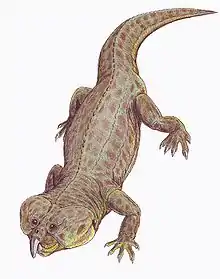 Prolacerta is a genus of archosauromorph from the lower Triassic of South Africa and Antarctica.[1][2] The only known species is Prolacerta broomi. The generic name Prolacerta is derived from Latin meaning “before lizard” and its species name broomi is in commemoration of the famous paleontologist Robert Broom, who discovered and studied many of the fossils found in rocks of the Karoo Supergroup. When first discovered, Prolacerta was considered to be ancestral to modern lizards, scientifically known as lacertilians.[3] However, a study by Gow (1975) instead found that it shared more similarities with the lineage that would lead to archosaurs such as crocodilians and dinosaurs (including birds). Prolacerta is considered by modern paleontologists to be among the closest relatives of the Archosauriformes.[1]