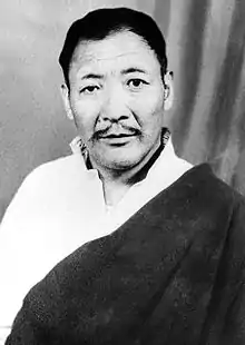"By sunset on March 9 [1959] thousands of men, women, children started to gather outside the walls of the Summer Palace."[18] On March 10, 1959, the crowd surrounded the summer palace in response to fear that the Communist Chinese People's Liberation Army (PLA) were planning to arrest the Dalai Lama at "a theatrical performance at the Chinese military camp at Silling-Bhuk."[19] The people were determined not to allow the Dalai Lama to leave Norbulingka palace. Some members of the crowd directed aggression at Tibetan officials that were thought to be Chinese collaborators. Tenpa Soepa, who was staying at a house on the night of March 10 near Norbulingka said, "When I arrived at the gate I found Kalon Sampho lying on the ground unconscious." Sampho, "...had arrived at Norbulinka [sic] in a car with his Chinese bodyguard. They got out of their car and when the crowd saw the Chinese guard they began throwing stones."[20] "Phakpalha Khenchung ...had been killed by the protestors. He was a government official, and it was rumored that he had a very close relationship with the Chinese."[20] PLA General Tan Kuan-sen considered the Dalai Lama to be in danger and offered him refuge if he could make it to the Chinese camp. He declined the offer. A week into the fighting, the general ordered two mortar rounds shot toward the palace. At that point, the Dalai Lama decided the time had come to slip out over the mountains, with a very small party, arriving a few days later at the Indian border.[21][22] He was granted asylum by the Nehru government with the stipulation that he would not engage in politics on Indian soil. Meanwhile, Enlai dissolved the Tibetan government and appointed the Preparatory Committee for the Founding of the Tibet Autonomous Region to take its place.[16] In 1959, Tenpa Soepa and other prisoners of war near Toema in Amdo said, "Along the road we could see why our guards were so jumpy. We saw many burnt-out guardposts and even some tanks that were destroyed by Tibetan guerillas. This was Amdo, where the guerrilla war had gone on for years."[20]