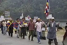 Over the years the Tibetan government in exile, the Central Tibetan Administration (CTA), has shifted the goal of its resistance stance from attempting measured cooperation with autonomy, to demanding full independence, to seeking "genuine autonomy for all Tibetans living in the three traditional provinces of Tibet within the framework of the People's Republic of China".[1] However, not all exiled Tibetans are content with pursuing the current CTA policy of the Middle Way Approach and many expressed their frustration in 2008, against the Dalai Lama's wishes, by agitating for independence.