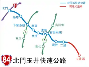 Provincial Highway 84 (Chinese: 台84線) is an expressway, which begins in Beimen, Tainan on the Provincial Highway No. 61 and ends in Yujing, Tainan on Zhongshan Road (Provincial Highway No. 20).