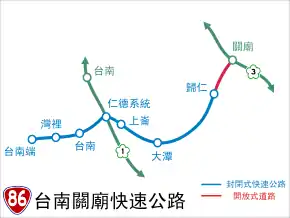 Provincial Highway 86 (Chinese: 台86線) is an expressway, which begins in South District, Tainan on Provincial Highway No. 17 and ends in Guanmiao District, Tainan on National Highway No. 3 in Taiwan.