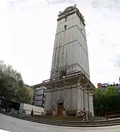 The Queen's Tower is situated in the South Kensington Campus of Imperial College London, England, just to the north of Imperial College Road. It is 87 metres (287ft) tall with a copper-covered dome at its top.[1] To reach the base of the dome from the ground on foot, one must ascend a series of narrow spiral staircases, comprising 325 steps in total. The tower used to be the central tower of the Imperial Institute, and is now the sole remaining part of that building.