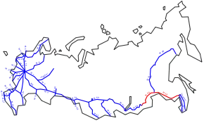 The Russian route R297 or the Amur Highway (so named after the nearby Amur River) is a federal highway in Russia, part of the Trans-Siberian Highway. With a length of 2,100 km (1,300 mi), it is the longest segment, from Chita to Khabarovsk, connecting the paved roads of Siberia with those of the Russian Far East.[1] The construction of the road united the Russian federal highways into a single system stretching from Saint Petersburg to Vladivostok. Before completion of the road, the Russian Pacific coast was connected to the rest of the country only by airlines, the Trans-Siberian Highway, and the Baikal–Amur Mainline.[2]