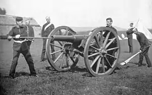 Many were re-issued to Volunteer Artillery Batteries of Position from 1889, with 16-pounders among 226 guns issued to the Volunteer Artillery during 1888 and 1889.[3] The 1893 the War Office Mobilisation Scheme shows the allocation of thirty seven Artillery Volunteer position batteries equipped with 16 Pounder guns which would be concentrated in Surrey and Essex in the event of mobilisation.[4] Most remained in use until 1902. In 1906 the 1st Shropshire and Staffordshire Royal Garrison Artillery Volunteers took them to their annual camp in Bare, Morecambe.[5] The last were not finally withdrawn until 1908.[6]
