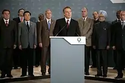 G8 leaders prepared a statement, read on behalf of them all by Tony Blair, condemning the attacks as "an attack on civilised peoples everywhere", and saying that the G8 summit would proceed.[45]