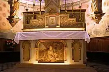 The village church dedicated to Saint Mary Magdalene has been rebuilt several times. The earliest church of which there is any evidence on the site may date to the 8th century. However, this original church was almost certainly in ruins by the 10th or 11th century, when another church was built upon the site—remnants of which can be seen in Romanesque pillared arcades on the north side of the apse. This survived in poor repair until the 19th century,[10] when it was renovated by the local priest, Bérenger Saunière. Surviving receipts and existing account books belonging to Saunière reveal that the renovation of the church, including works on the presbytery and cemetery, cost 11,605 Francs over a ten-year period between 1887 and 1897.[11] With inflation that figure is equivalent to approximately 30 million Francs as of 2019, or 4.5 million Euros.