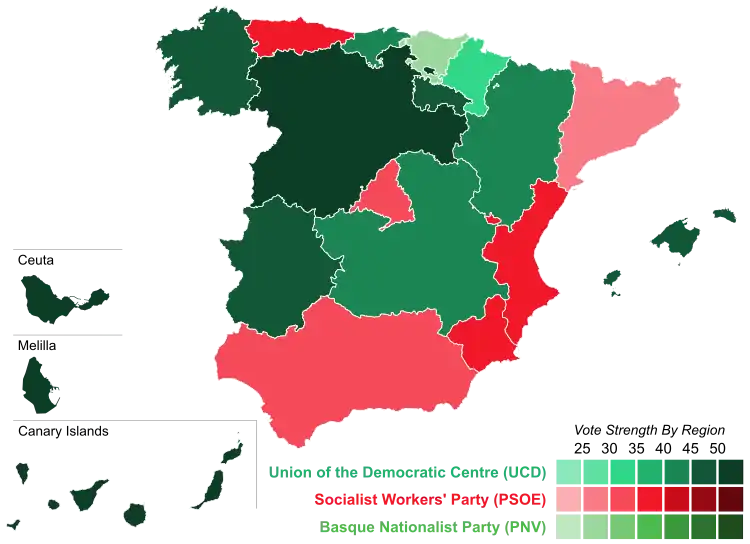 | Union of the Democratic Centre (UCD) | 6,268,593 | 34.84 | +0.40 | 168 | +3 | |