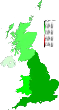 All the counting areas within the United Kingdom returned large majority 'Yes' votes except for two Scottish regions, the Shetland Islands and the Western Isles, which returned majority votes in favour of 'No'.