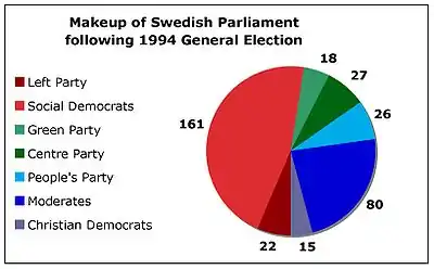 Sweden held a general election on 18 September 1994. As of the 2018 election, this was the final time in which the Social Democrats won more than 45 % of the overall vote, marking a steady decline thereafter. The Green Party replaced the New Democracy party in the Riksdag, with the seven elected parties being represented in parliament into the 2020s after the Christian Democrats narrowly beat the parliamentary 4 % threshold by a mere 3,752 votes.[1]