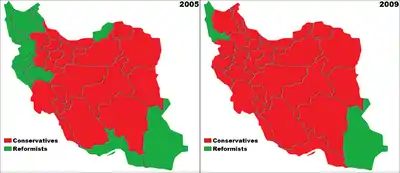 BBC Iranian affairs analyst Sadeq Saba found abnormalities in the way results were announced. Instead of results by province, the "results came in blocks of millions of votes," with very little difference between the blocks in the percentages going to each candidate. This suggested that Mahmoud Ahmadinejad did equally well in rural and urban areas, while his three opponents did equally badly in their home regions and provinces as in the rest of the country. This contradicted "all precedent in Iranian politics", where Ahmadinejad had been very popular in rural areas and unpopular in the big cities, where ethnic minorities had favored anti-establishment candidates, and where candidates had tended to carry their home provinces.[13] Another anomaly, according to British-based researcher Ali Alizadeh, is that a large turnout did not favor the opposition, since in elections, both in Iran and abroad, "those who usually don’t vote, i.e. the silent majority, only come out when they want to change the status quo."[14] Historically, low turnout has always favored conservatives in Iranian elections, while high turnout favors reformers. That's because Iran's most reliable voters are those who believe in the system; those who are critical tend to be reluctant to participate.[15] According to modern Middle Eastern and South Asian historian Juan Cole, there were several anomalies in the election results. Official reports gave Ahmadinejad 50% of the vote in the city of Tabriz despite the fact that this was the capital of Mousavi's home province, Eastern Azerbaijan, where Mousavi's rallies were well attended and which has traditionally given good turnouts for even "minor presidential candidates" who came from the province. Ahmadinejad also won Tehran by over 50%, even though his popularity in larger cities is considered to be low. Meanwhile, Karroubi, who received 17 percent in the first round of the 2005 presidential elections, got less than one percent of the vote this time,[16] and lost even his own province of birth, despite the tendency for Iranian voting to follow ethnic lines.[17] A survey of votes by a London-based think tank Chatham House found that in a third of all provinces, the official results would require that Ahmadinejad had received "not only all former conservative voters, all former centrist voters and all new voters but also up to 44 percent of former reformist voters -- despite a decade of conflict between these two groups.".[18][19]