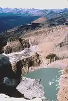 Methods for measuring retreat include staking terminus location, global positioning mapping, aerial mapping and laser altimetry.[4][6] The key symptom of disequilibrium is thinning along the entire length of the glacier. This indicates a diminishment of the accumulation zone. The result is marginal recession of the accumulation zone margin, not just of the terminus. In effect, the glacier no longer has a consistent accumulation zone and without an accumulation zone cannot survive.[5][7]
