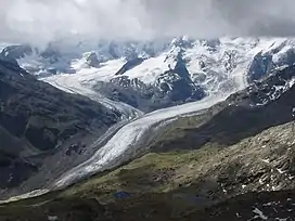 The Morteratsch Glacier in Switzerland has had one of the longest periods of scientific study with yearly measurements of the glacier's length commencing in 1878. The overall retreat from 1878 to 1998 has been 2 km (1.2 mi) with a mean annual retreat rate of approximately 17 m (56 ft) per year. This long-term average was markedly surpassed in recent years with the glacier receding 30 m (98 ft) per year during the period between 1999 and 2005. Similarly, of the glaciers in the Italian Alps, only about a third were in retreat in 1980, while by 1999, 89% of these glaciers were retreating. In 2005, the Italian Glacier Commission found that 123 glaciers in Lombardy were retreating.[17] A random study of the Sforzellina Glacier in the Italian Alps indicated that the rate of retreat from 2002 to 2006 was much higher than in the preceding 35 years.[18] To study glaciers located in the alpine regions of Lombardy, researchers compared a series of aerial and ground images taken from the 1950s through the early 21st century and deduced that between the years 1954–2003 the mostly smaller glaciers found there lost more than half of their area.[19] Repeat photography of glaciers in the Alps indicates that there has been significant retreat since studies commenced.[20]