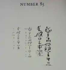 | Number 85 | A small group of cursive hieroglyphic signs is written, which Chace suggests may represent the scribe "trying his pen". It appears to be a phrase or sentence of some kind, and two translations are suggested. 1) "Kill vermin, mice, fresh weeds, numerous spiders. Pray the god Re for warmth, wind and high water." 2) Interpret this strange matter, which the scribe wrote ... according to what he knew." |