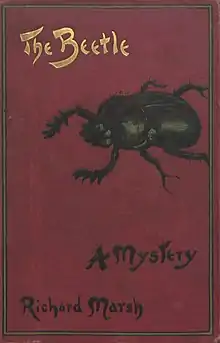 Marsh's greatest commercial success was one of his earlier novels, The Beetle (1897).[2] A story about a mysterious oriental person who pursues a British politician to London, where he wreaks havoc with his powers of hypnosis and shape-shifting, Marsh's novel is similar in some respects to certain other novels of the same period, such as Bram Stoker's Dracula, George du Maurier's Trilby, and Sax Rohmer's Fu Manchu novels. Like Dracula and many of the sensation novels pioneered by Wilkie Collins and others during the 1860s, The Beetle is narrated from the perspectives of multiple characters, a technique used in many late 19th-century novels (those of Wilkie Collins and Stoker, for example) to create suspense. The novel engages with numerous themes and problems of the Victorian fin de siècle, including the New Woman, unemployment and urban destitution, radical politics, homosexuality, science, and Britain's imperial engagements (in particular those in Egypt and the Sudan). "The Beetle" sold out upon its initial printing, and continued to sell well and to be published for several decades into the 20th century. The novel was made into a film in 1919, with Leal Douglas in "the polymorphous title role",[13] and adapted for the London stage in 1928.