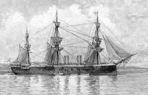 Meade became Junior Naval Lord in the Second Disraeli ministry in May 1874 and, having been promoted to rear admiral on 31 December 1876,[5] was appointed a Companion of the Order of the Bath on 2 June 1877.[6] He succeeded to his father's titles in October 1879 and was elevated to Second Naval Lord in the same ministry in December 1879 where he sat until the Government fell in May 1880.[3] He became commander of the Flying Squadron, with his flag in the frigate HMS Inconstant in August 1880, and was promoted to vice-admiral on 26 July 1881.[7] However, while the squadron was in port at Sydney on 22 July, he "suffered a fainting fit, the attack resembling paralysis."[8] The effects were severe enough to delay the departure of the squadron, planned for 24 July, to 10 August.[9][10]