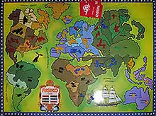 Equipment includes a large tabletop board depicting a political map of the world, divided into forty-two territories, which are grouped into six continents by color. In addition to shared boundaries between territories which define routes of attack/defense, numerous special trans-oceanic or trans-sea routes are also marked; for example, the route between North Africa and Brazil. The oceans and seas are not part of the playing field.