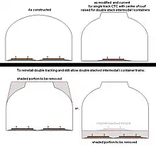 If double tracking is reinstated, the existing track down the center would need to be realigned to one side of the tunnel (to its original double track alignment) to permit the other track to be re-installed. This would now require either the entire width of the tunnel roof to be raised, or the full width of the roadbed lowered to permit double stack intermodal / container trains to use these tunnels.