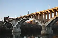 The Robert H. Mollohan-Jefferson Street Bridge, also known as the Million Dollar Bridge or High Level Bridge, is located in Fairmont, Marion County, West Virginia. It was dedicated on May 30, 1921. This bridge connects east and west Fairmont, and crosses the Monongahela River. After falling into poor repair over the years, it was preserved, repaired, and reopened in October 2000. The bridge is now a significant historic landmark in the city.[1][2]