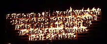 Often installed unauthorised amid industrial and urban sites, Montgomery's installations address universal themes such as power, love, and human kindness with sparse language and dramatic visuals.[7] These text-based conceptual pieces categorised as recycled sunlight pieces, billboard pieces, fire poems, woodcut panels, and watercolors.[8] Montgomery's cryptic and emotionally resonant poetry comments on contemporary life and affirms his personal and philosophical beliefs, which he describes as "melancholic post-Situationist", a 20th-century antiauthoritarian Marxist movement.[7]
