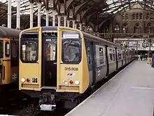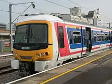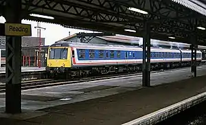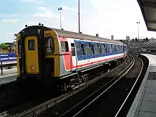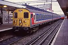 Network SouthEast inherited a large fleet of electric multiple units (EMUs), smaller numbers of diesel (DMU) and diesel electric (DEMU) multiple units, and some diesel locomotives and coaching stock.[1] Much of the fleet was introduced after the 1955 Modernisation Plan; stock was old (some dated from before World War II) and in variable condition, giving a "drab" and "uninspiring" appearance, and was difficult to convert to driver-only operation.[2] Accordingly, the sector invested in many new vehicles during its eight-year history. After initial problems, the Networker range of units proved very successful and is still used across southeast England on the privatised rail network. The same applies to the innovative Class 319 dual-voltage units, built for NSE's new Thameslink service which operated on two incompatible types of electrified line.[3]
