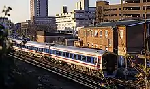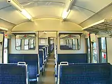 Network SouthEast's fleet of EMUs featured seven different body designs, from 1930s styles based on stock designed by Oliver Bulleid to the "modernistic but attractive" lightweight aluminium Networker range designed "from the ground up" by NSE's own design team.[11][13] Most vehicles were based on British Rail's standardised Mark 1, Mark 2 and Mark 3 carriages, but there were variations in construction materials (welded steel panels, or steel or aluminium bodies of integral construction), door types (slam-doors or automatic sliding doors), underframe styles, cab fronts and internal layouts.[11] NSE put great emphasis on interior design and the application of its standard livery.[14] Rolling stock of all types was painted in the network's "house colours" of red, white blue and grey horizontal bands, swept up diagonally at the end of each unit.[15] Compared to this bold, bright exterior decoration—popularly likened to toothpaste[16][17] because of its striped pattern—interiors were plainer and more "restful", featuring grey, blue or white plastic panelling, blue seat moquette and fluorescent strip lights. Most stock had open (saloon-style) seating by the start of the NSE era, but some First Class compartments survived throughout the period.[18]