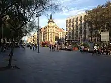 Ronda de la Universitat is a major thoroughfare of central Barcelona, Catalonia, Spain, in lower side of the Dreta de l'Eixample, in the Eixample district. It links two of the city's three main squares, running from Plaça de Catalunya towards Plaça Universitat. There it meets Gran Via de les Corts Catalanes and Ronda de Sant Antoni begins. It's essentially the same street as Ronda de Sant Pere, which follows it right after Plaça de Catalunya. As the other ronda, it follows the original outline of the medieval city walls,[1] particularly the wall of Tallers, above the area nowadays known as Raval, where a road called Carrer de Tallers runs partially parallel to it. Ronda de la Universitat was paved in 1872. It takes its name from the Universitat de Barcelona, which has had its main building at Plaça Universitat since the 19th century. Before its current name was approved in 1989, its official name was in Spanish: Universidad.[2] The Biblioteca Judicial de Catalunya is on this street.